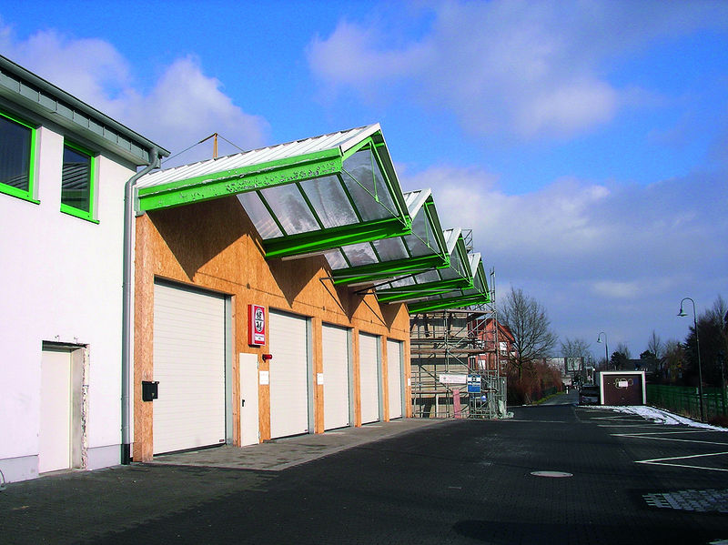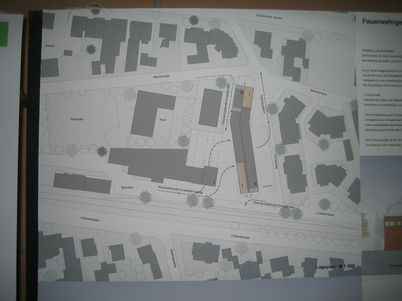 Dem Neubau für das Feuerwehrgerätehaus mit Rettungswache kommt nach Ansicht der Architekten die Aufgabe zu, zwischen der Wohnbebauung östlich und den Gewerbebauten westlich des Grundstücks zu vermitteln. Neben funktionalen Vorteilen sorgt das Abwinkeln des Gebäudes für eine selbstverständliche Eingliederung. Die vorherrschenden städtebaulichen Richtungen werden in dem Gebäude aufgenommen und zusammengeführt. Die benachbarte Wohnbebauung wird durch das Gebäude vom Übungshof abgeschirmt. Das Raiffeisengebäude wird durch den Baukörper der Waschhalle angebunden. Die Stellplätze des Rettungsdienstes sowie die zugehörigen Aufenthaltsräume liegen im nördlichen Grundstücksteil unmittelbar an der Alarmausfahrt. Die Schrägstellung der Fahrzeughalle der Feuerwehr parallel zum benachbarten Wohnungsbau ermöglicht trotz einer vorgelagerten Staufläche für alle Fahrzeugstellplätze und einer außerhalb der Staufläche liegenden Fahrspur eine Maximierung der Größe des Übungshofes.
